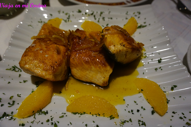 Como segundos probamos el salmón en salsa de naranja, que estaba también fresco , con naranja y una salsa agridulce que acompañaba muy bien al salmón.